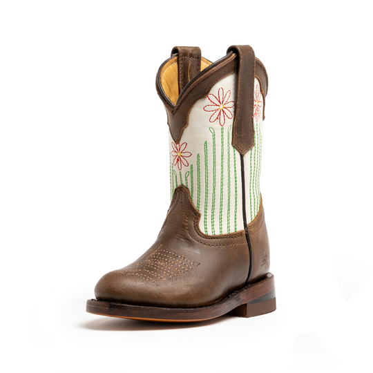 The Margie Grace boot brings charm and classic Western style to your little one’s wardrobe. Crafted in a warm, earthy brown leather, this boot is delicately adorned with flower stitching, giving it a sweet yet rugged touch. Perfect for adventures in the backyard or family outings, these boots offer both comfort and durability, with sturdy soles that keep up with every step. The Margie Grace is a delightful addition to any kid’s collection, designed to add a little flower power to every stomp, skip, and stride!