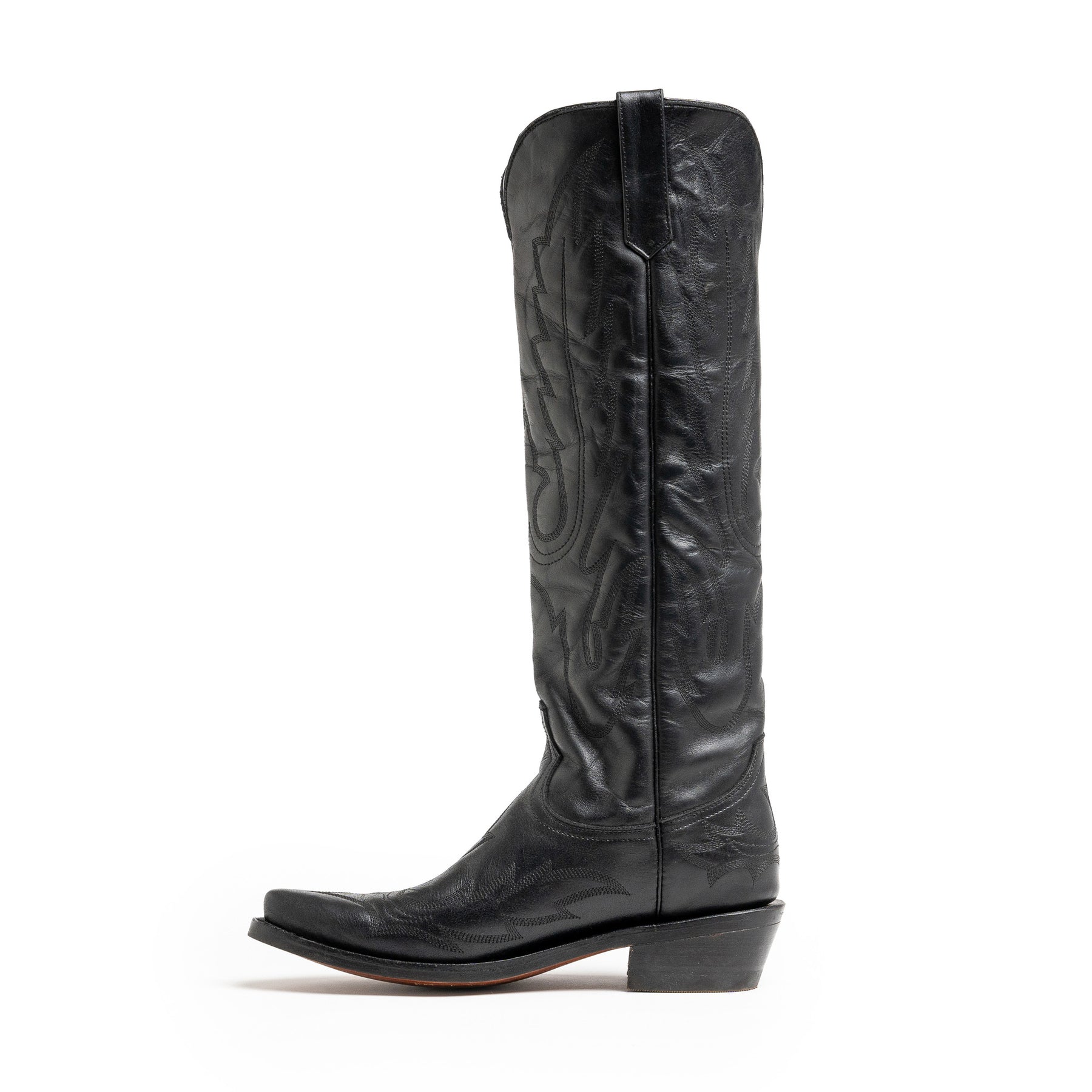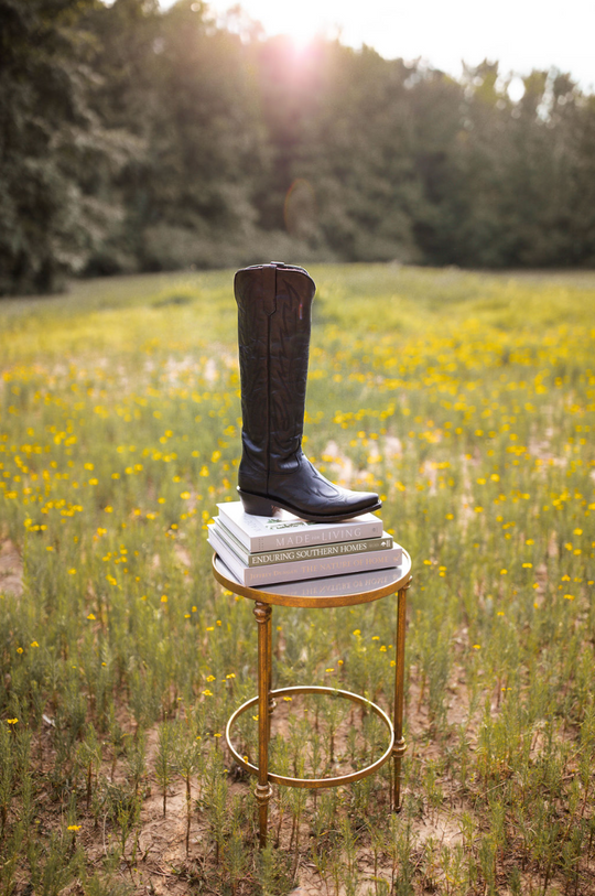 The Lauren. Step into elegance with the perfect blend of tradition and modern style. Our black knee-high ladies' western boots are crafted with luxurious bovine leather, featuring intricate stitching that highlights the iconic western design. The sleek silhouette is complemented by a stacked heel for added height and comfort, making it versatile enough to pair with anything from dresses to jeans. These boots effortlessly transition from day to night, offering a timeless addition to your collection that never goes out of style.
