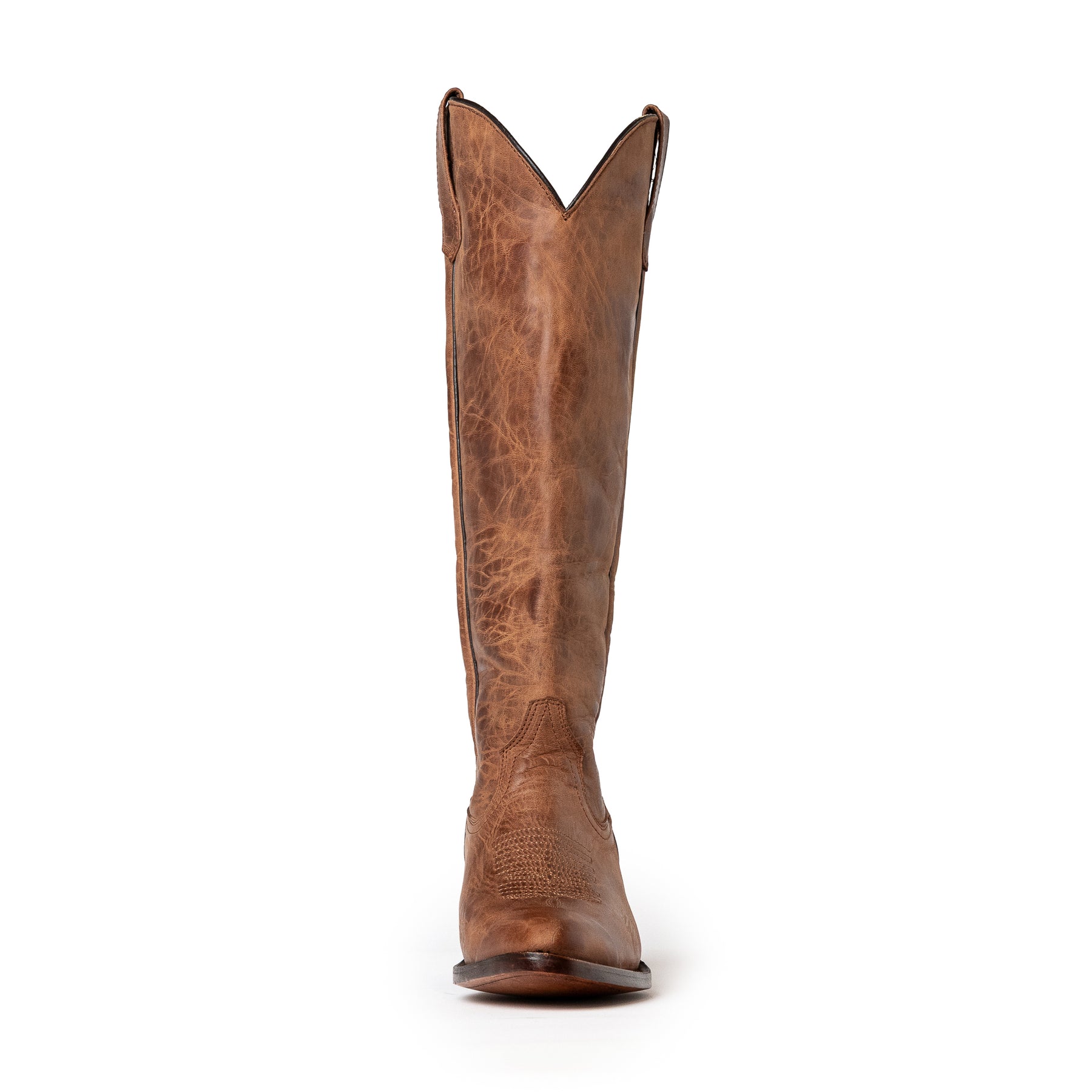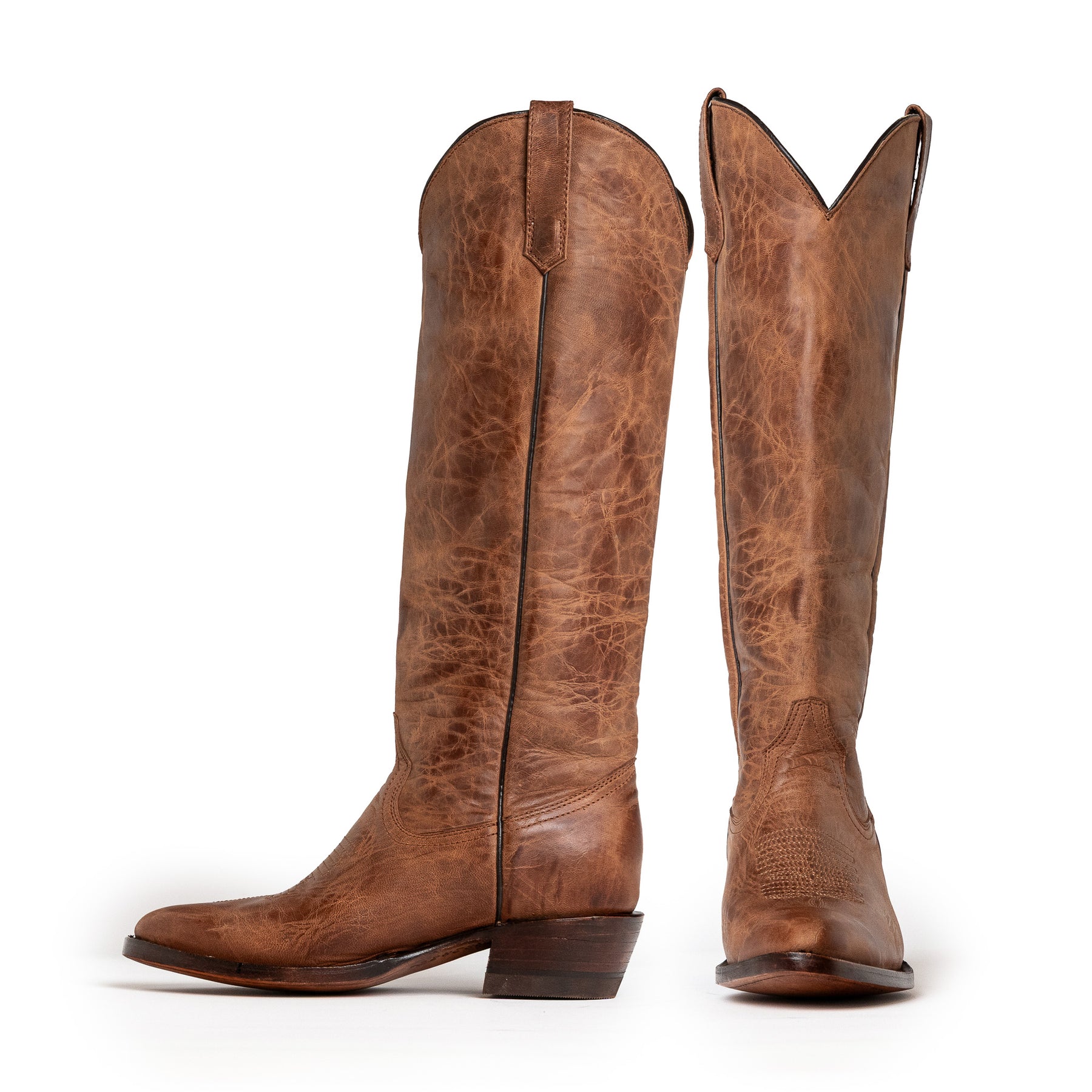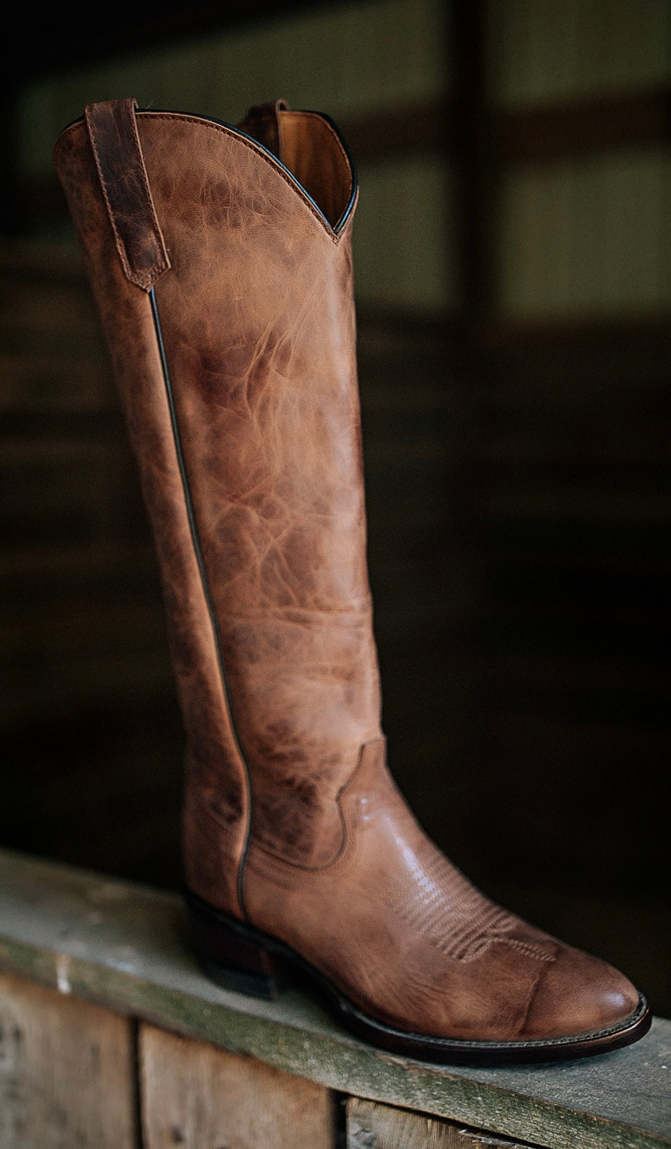 The Sand Creek. Radiate confidence and style with our tan knee-high western boots, where our classic round toe meets contemporary flair. Crafted from high-quality sierra goat leather, with a structured, comfortable fit and a sleek design. They offer all-day wearability, adding a striking contrast to any outfit. Perfect for those who want to make a statement while embracing the timeless beauty of the western style, these boots bring a refreshing twist to a beloved classic.